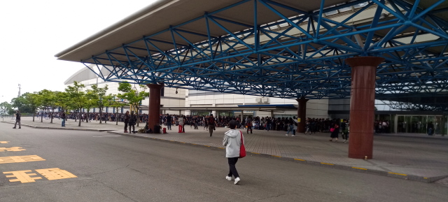 Nachdem sich die ersten zum Eingangsbereich aufmachen, verabschieden wir uns auch und begeben uns zum Sammelplatz. Im Gegensatz zu Kobe ist es diesmal recht chaotisch, es sind zwar nummerierte Reihen angedeutet aber diese ergeben diesmal keinen Sinn, da wir direkt vor dem Eingang stehen und jede Ticketnummer einzeln aufgerufen wird… bei 1160 bin ich endlich dran und auch flott drin. K-Block, nicht schlecht, relativ in der Mitte und da ich weiß, dass es eine fahrbare Bühne geben wird, sollte es geradezu ideal werden.