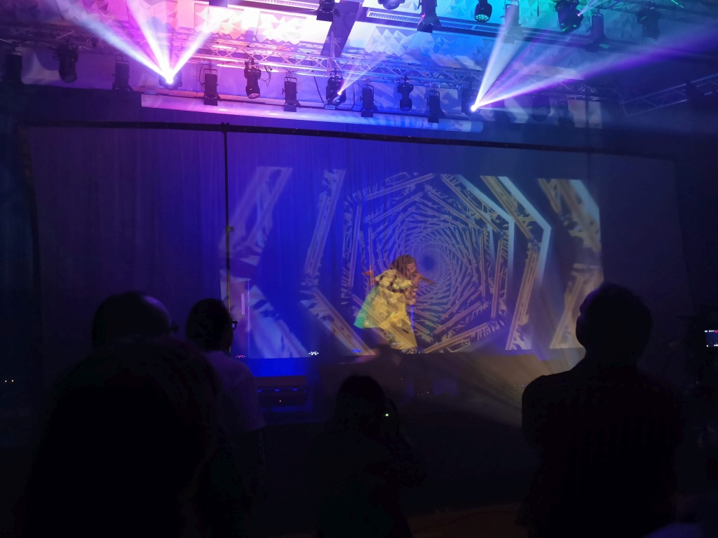 …und das scheit ein Teil des Publikums ähnlich zu sehen, kaum erscheint der SE Film auf der Leinwand im Hintergrund der Bühne bilden sich das erste mal an diesem Abend aus dem vorher eher locker verteilten Zuschauern so etwas wie Reihen vor der Bühne.